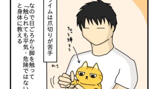 爪切りが苦手でいっつも逃げる。最近は頭からきんちゃく袋みたいな布をかぶせて、視界を防いでから爪を切っていますが…。何だか強制させているみたいで主人的には理想的では無い。ただ足を触って「またコレか」と思って貰えるなら、爪切りも「またコレかぁ、...